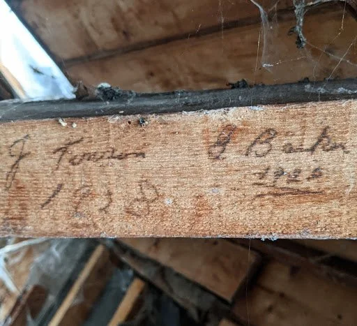 One of the pleasures of working on such a special building which has evolved so interestingly over such a long time, is that its subtler details tend to be revealed, or noticed, gradually: the carpenter’s assembly marks on exposed beams; the striking, well-preserved 200-year-old wallpaper, semi-hidden beneath a narrow second-floor staircase; and the signatures left behind by those working inside the roof in the early 20th century, such as those shown below.